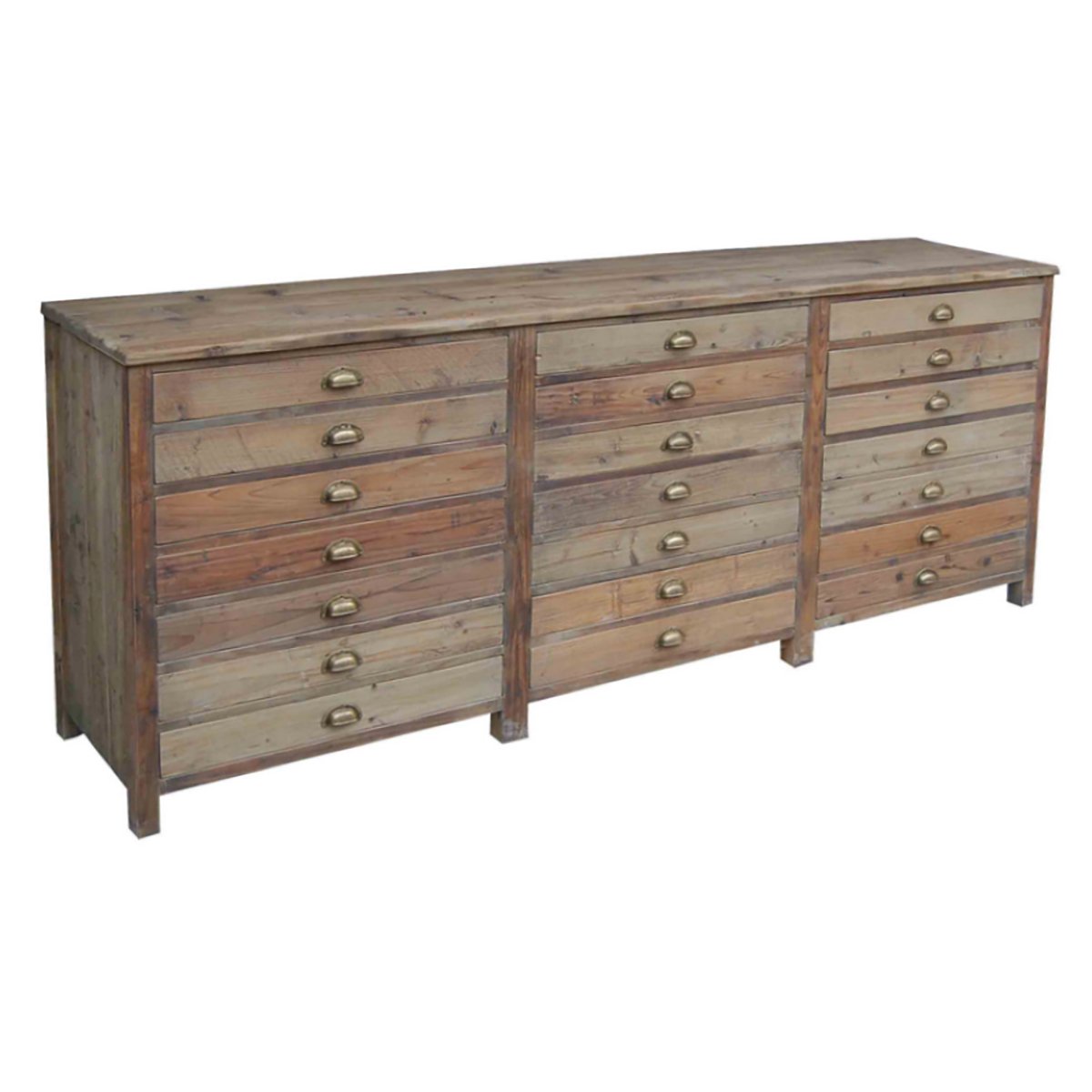 Credenza in Abete Vecchio 21 cassetti con maniglie di metallo.