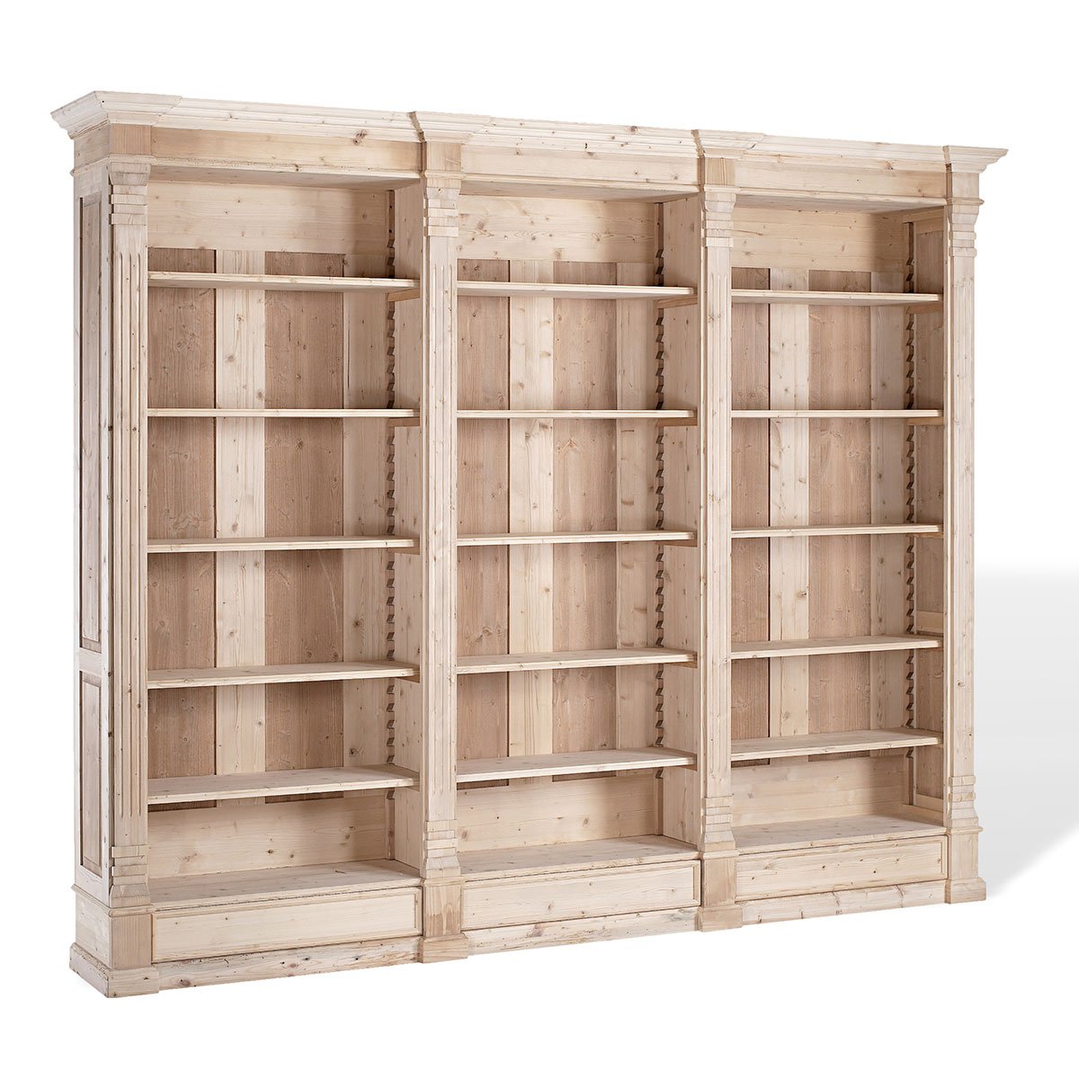 Libreria a giorno in abete al grezzo con 3 cassetti e ripiani regolabili.