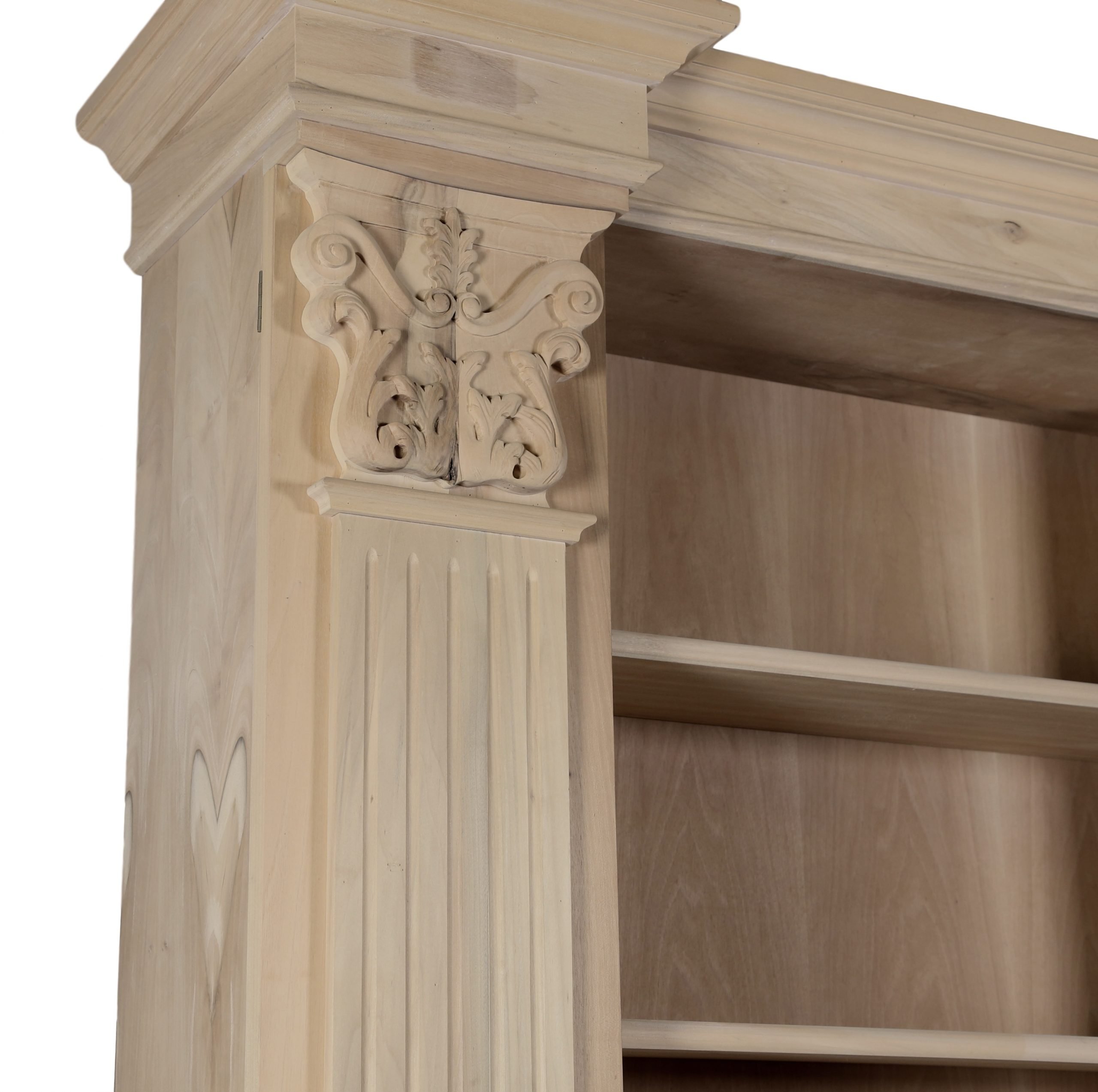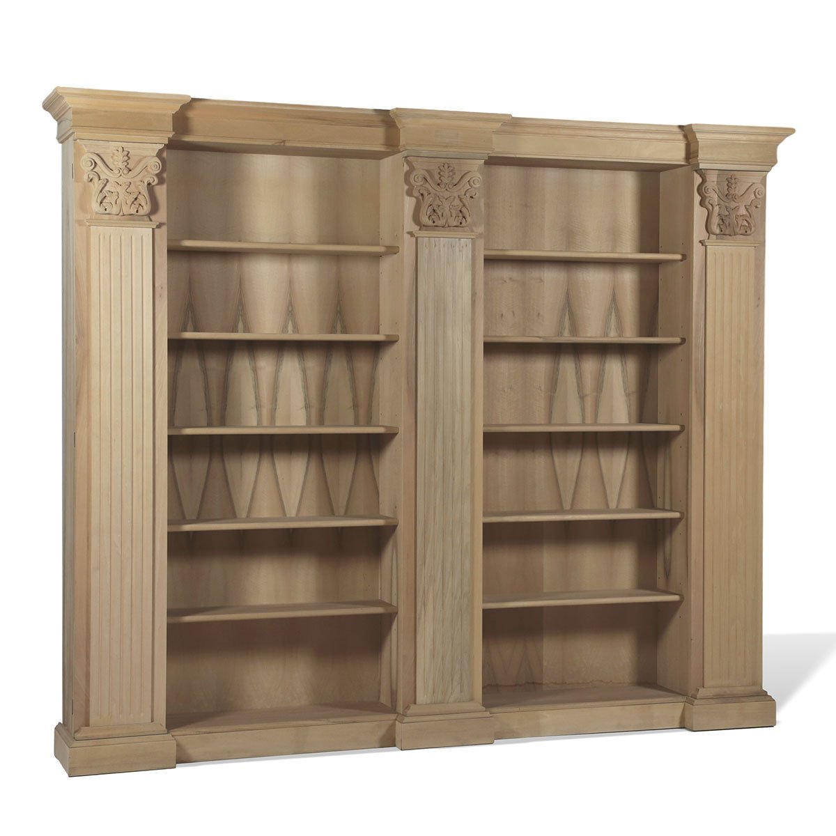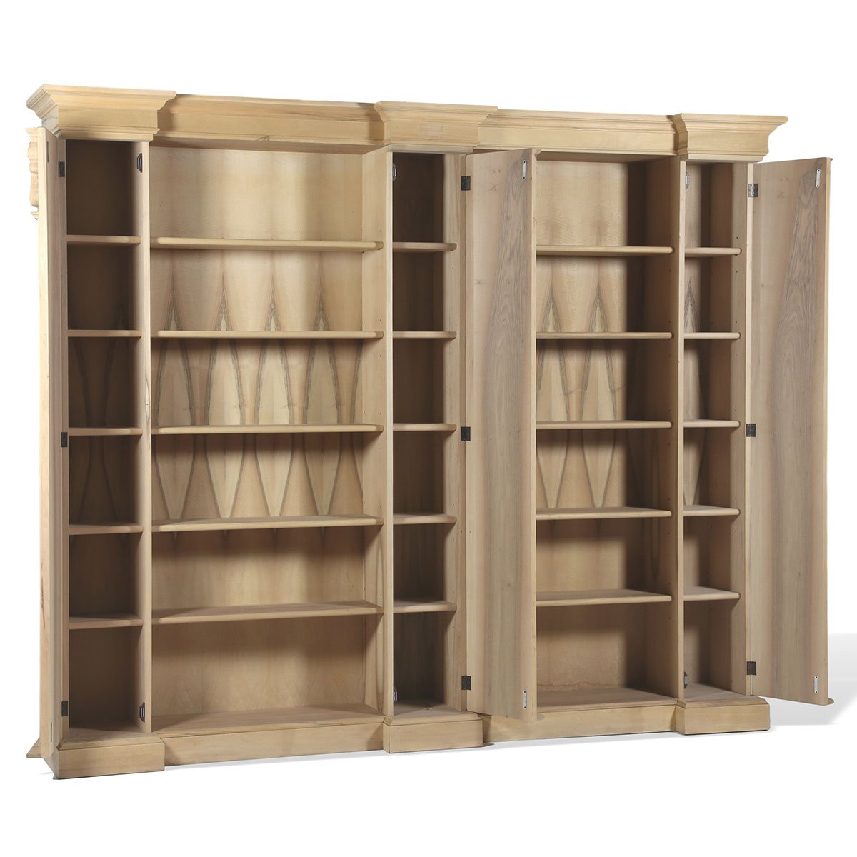 Libreria al grezzo realizzata in noce, con 3 porte, 2 vani a giorno. Ripiani Totali: 25. Smontabile.